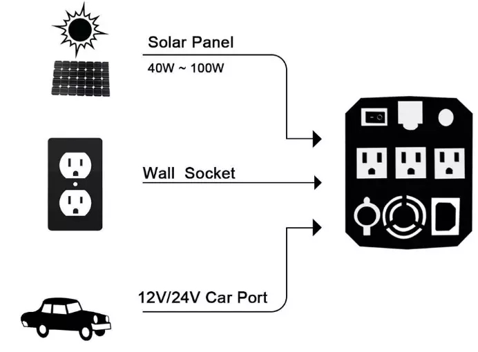 Als AC / DC 12 V / 220 V / 5 V-Ausgang eignet es sich für verschiedene Geräte wie Mobiltelefone, Tablets, Laptops, kleine Drucker, Arten von Lampen und Laternen, kleine Aquariumheizungen, Fotoausrüstungen,